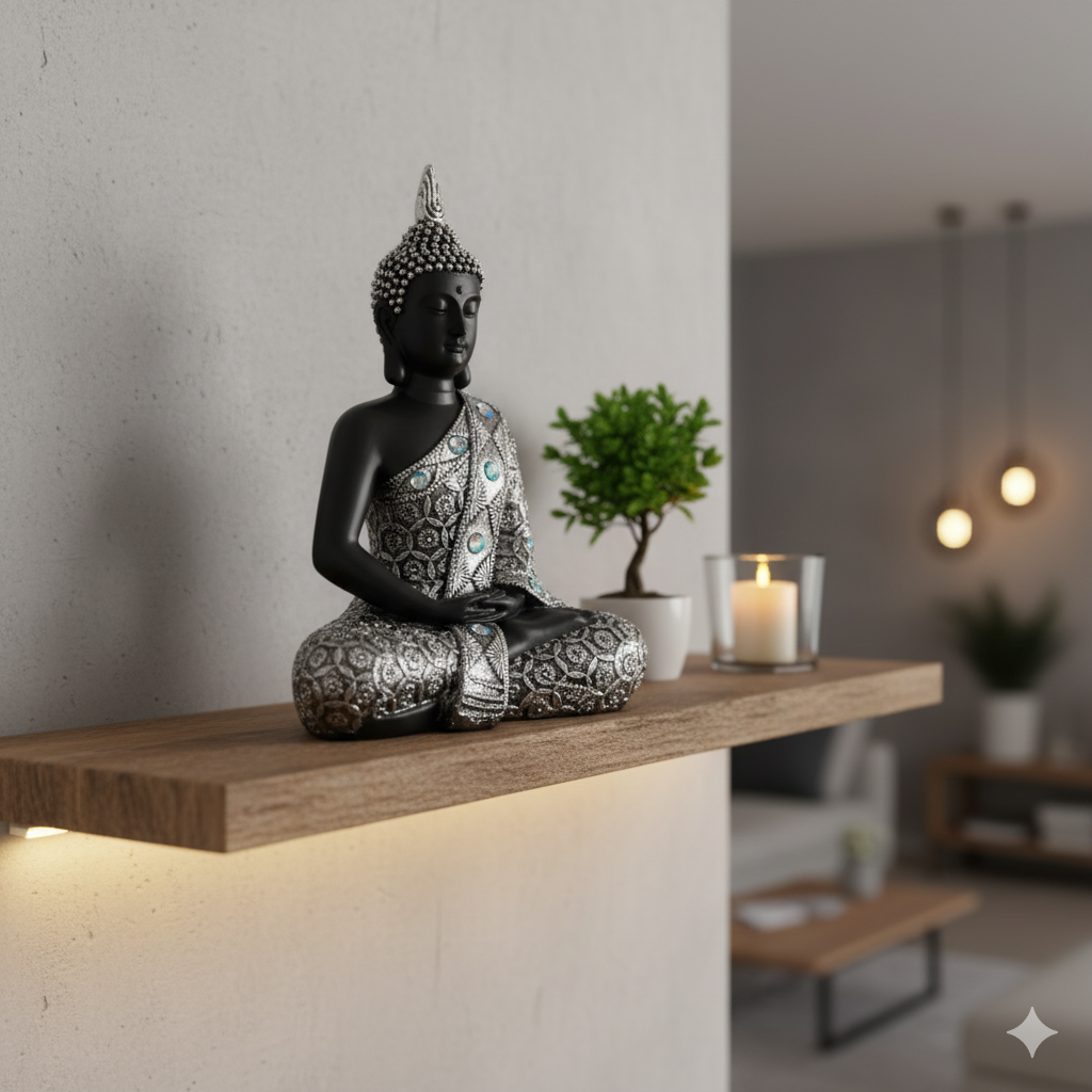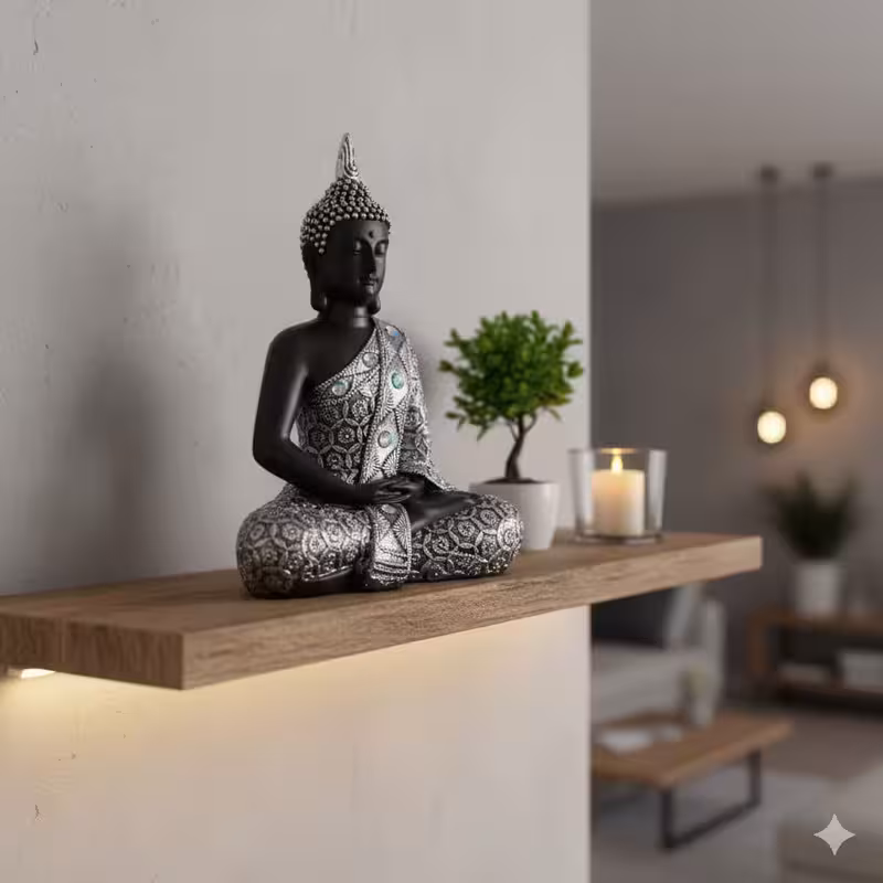 Escultura de 30 cm fabricada en acrílico con acabado plateado. Una pieza espiritual y moderna que aporta equilibrio y armonía, ideal para interiores o como detalle especial en exteriores cubiertos.