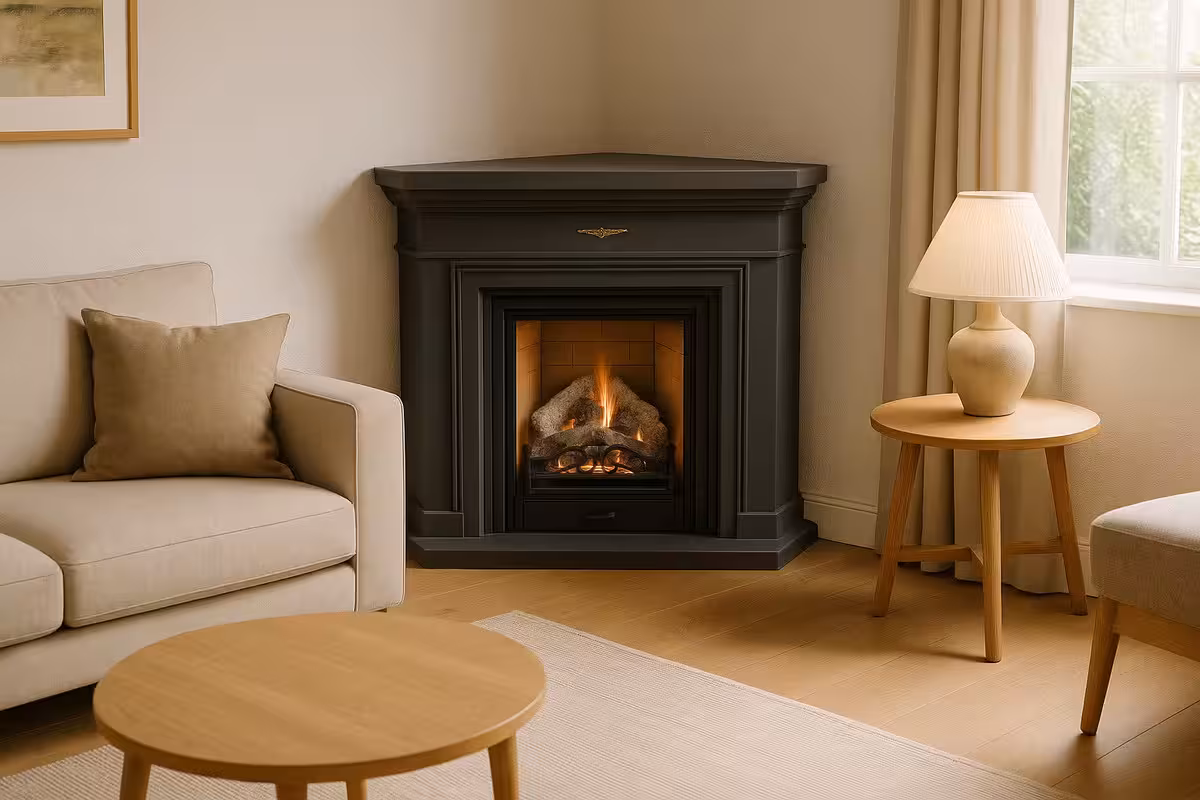 Hogar esquinero de chapa con leño, ideal para aprovechar espacios y calefaccionar con eficiencia. Su estructura sólida garantiza durabilidad y un estilo funcional para tu hogar.