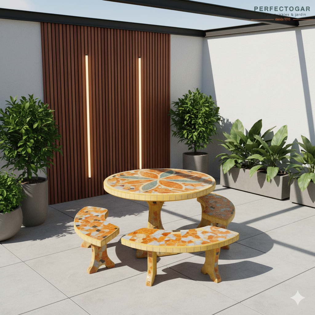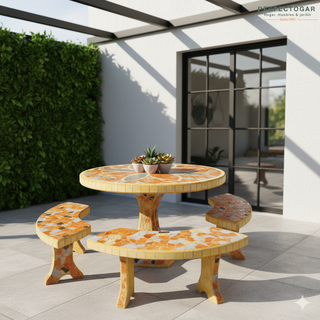 El Juego de Cerámica Redondo de RM incluye una mesa con pie de 125 cm y 4 bancos cortos. Su diseño robusto en cerámica asegura durabilidad y estilo, convirtiéndolo en una opción ideal para patios, galerías y quinchos donde se busca estética y funcionalidad.