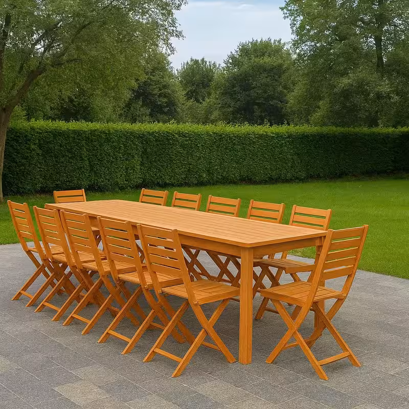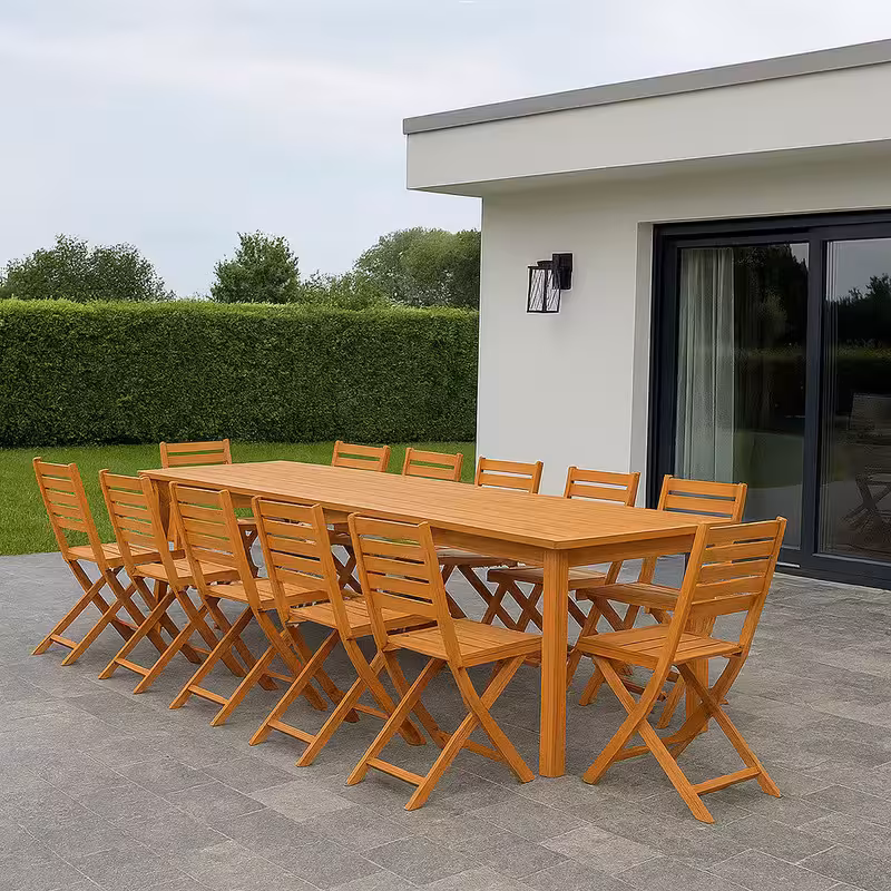 El Juego Uruguai Max de Ecomadera incluye una mesa extensible de 180/250 x 95 cm, 8 sillas plegables y 2 sillas plegables con apoyabrazos. Un conjunto robusto y elegante, ideal para disfrutar de comidas al aire libre con familia y amigos, combinando practicidad y diseño natural.
