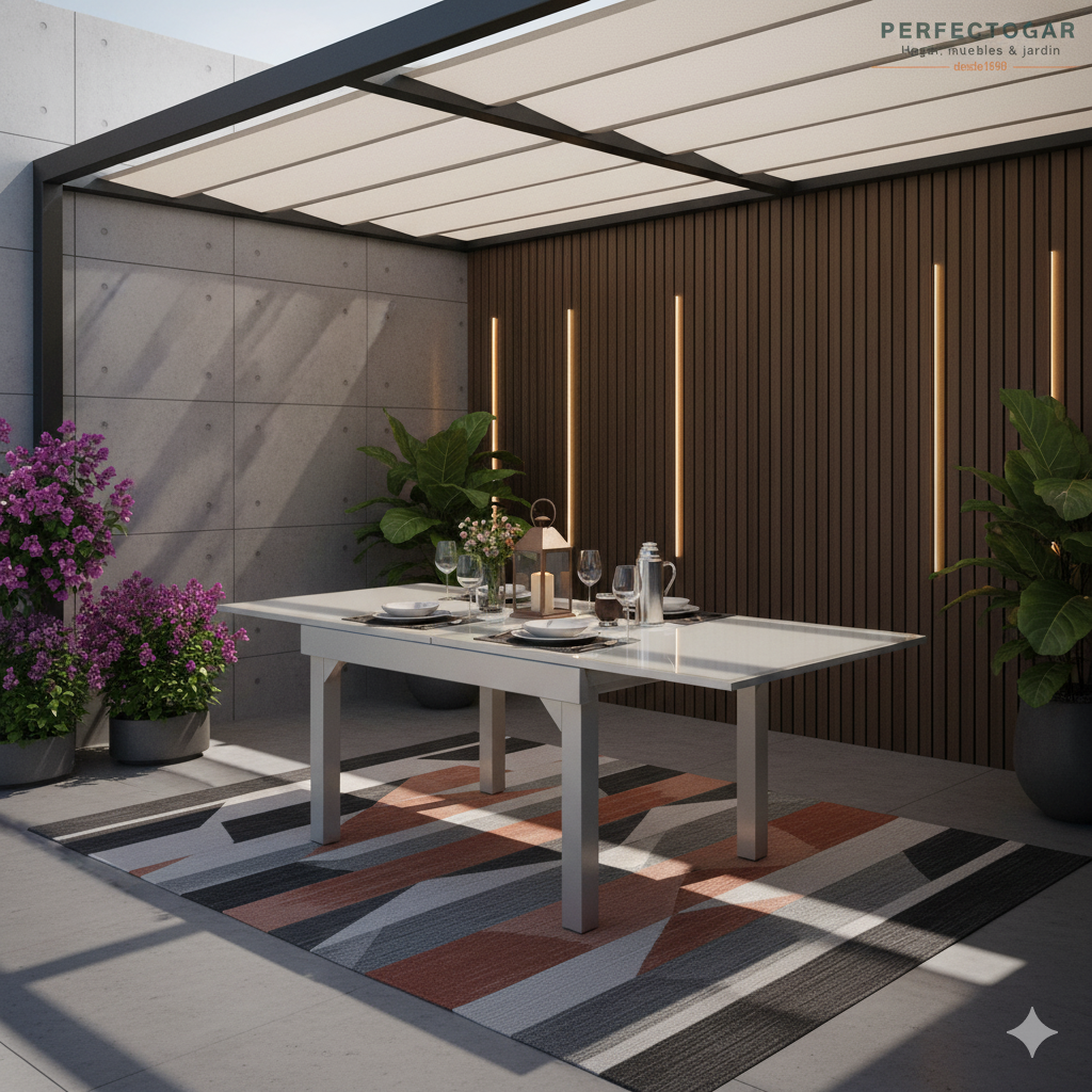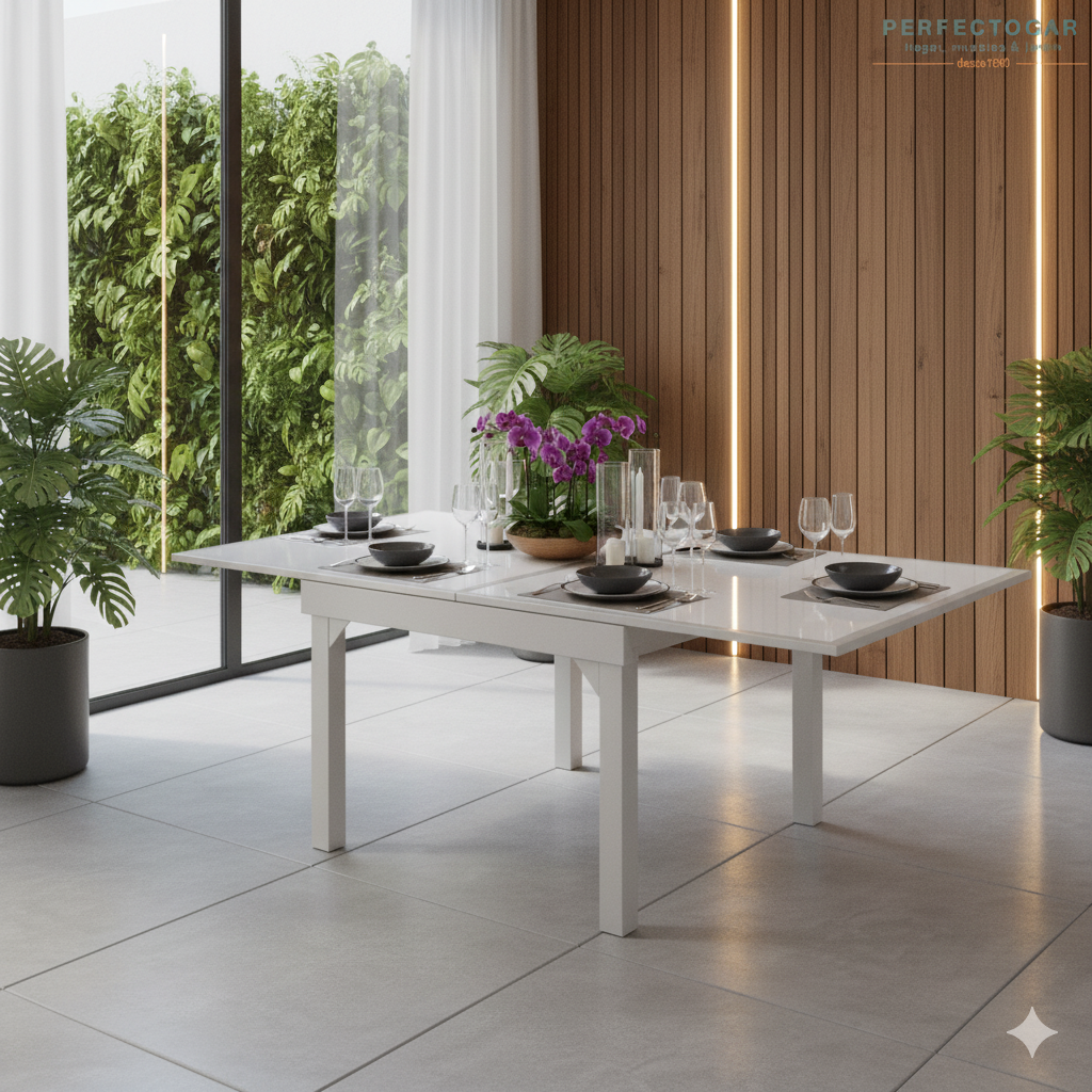 👉 Mesa de aluminio con tapa de vidrio templado, extensible.