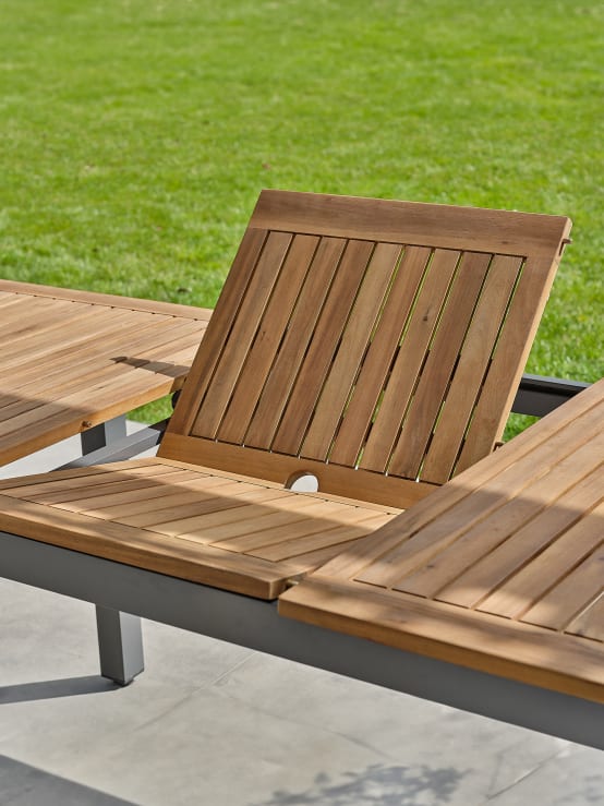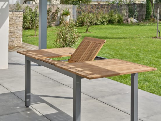 Combina la solidez del aluminio con la calidez de la madera teka. Largo regulable para adaptarse a tus reuniones, con líneas modernas y mantenimiento sencillo.