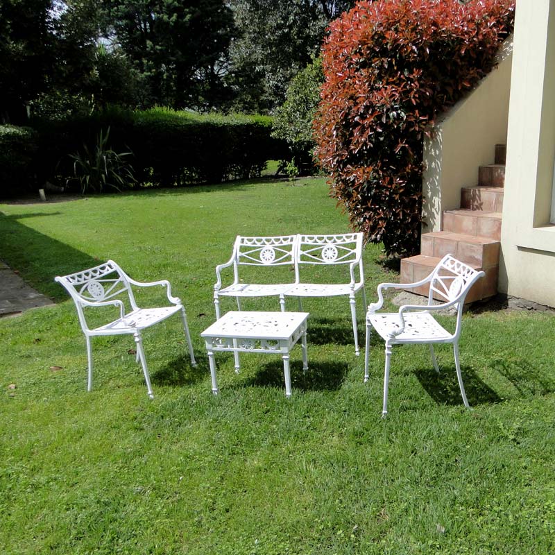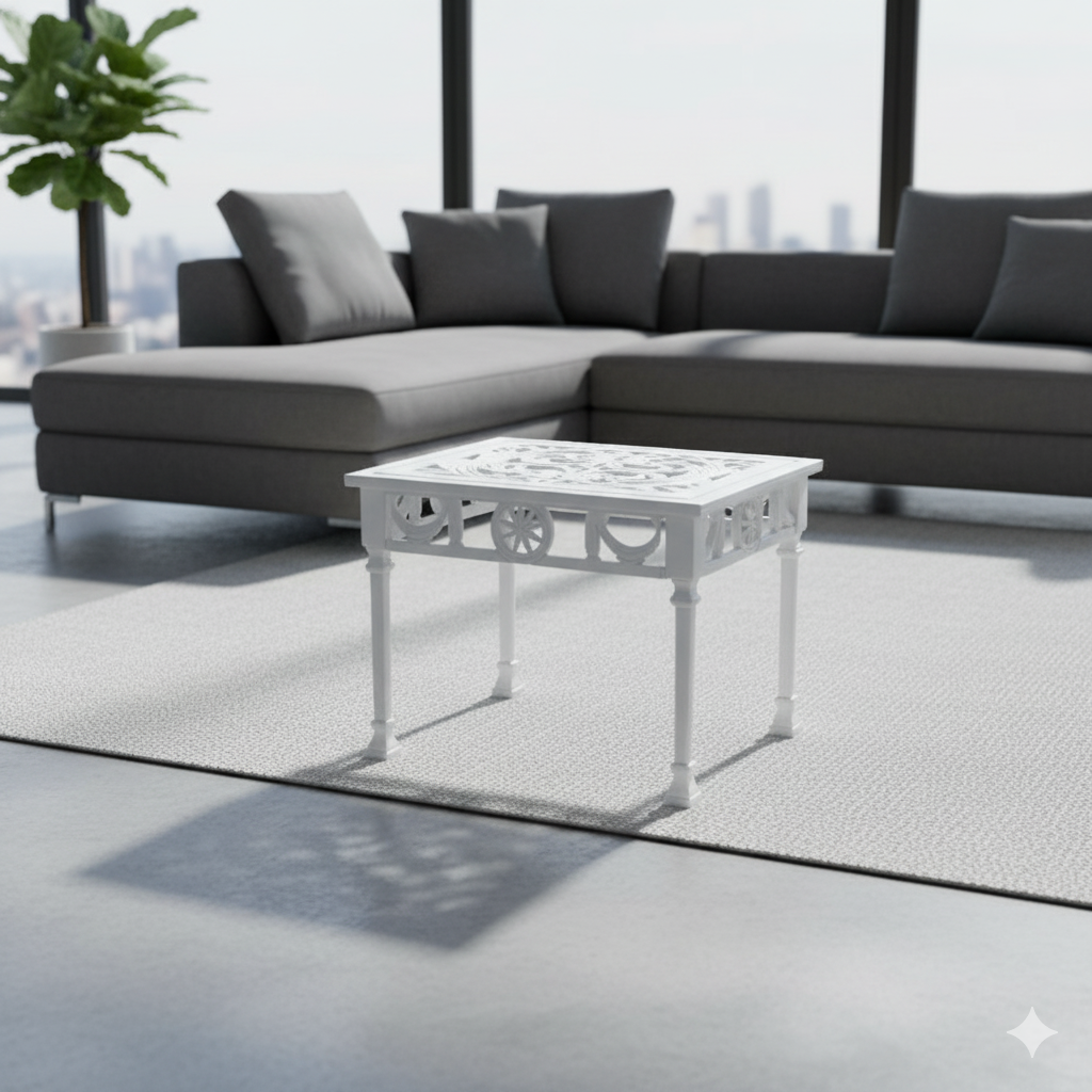 Mesa Sutra chica de 50 x 42 cm, construida completamente en fundición de aluminio y pintada con pintura epoxi en diversos colores y pátinas. Ideal para complementar livings, galerías o conjuntos exteriores, combinando elegancia y resistencia con fácil mantenimiento.