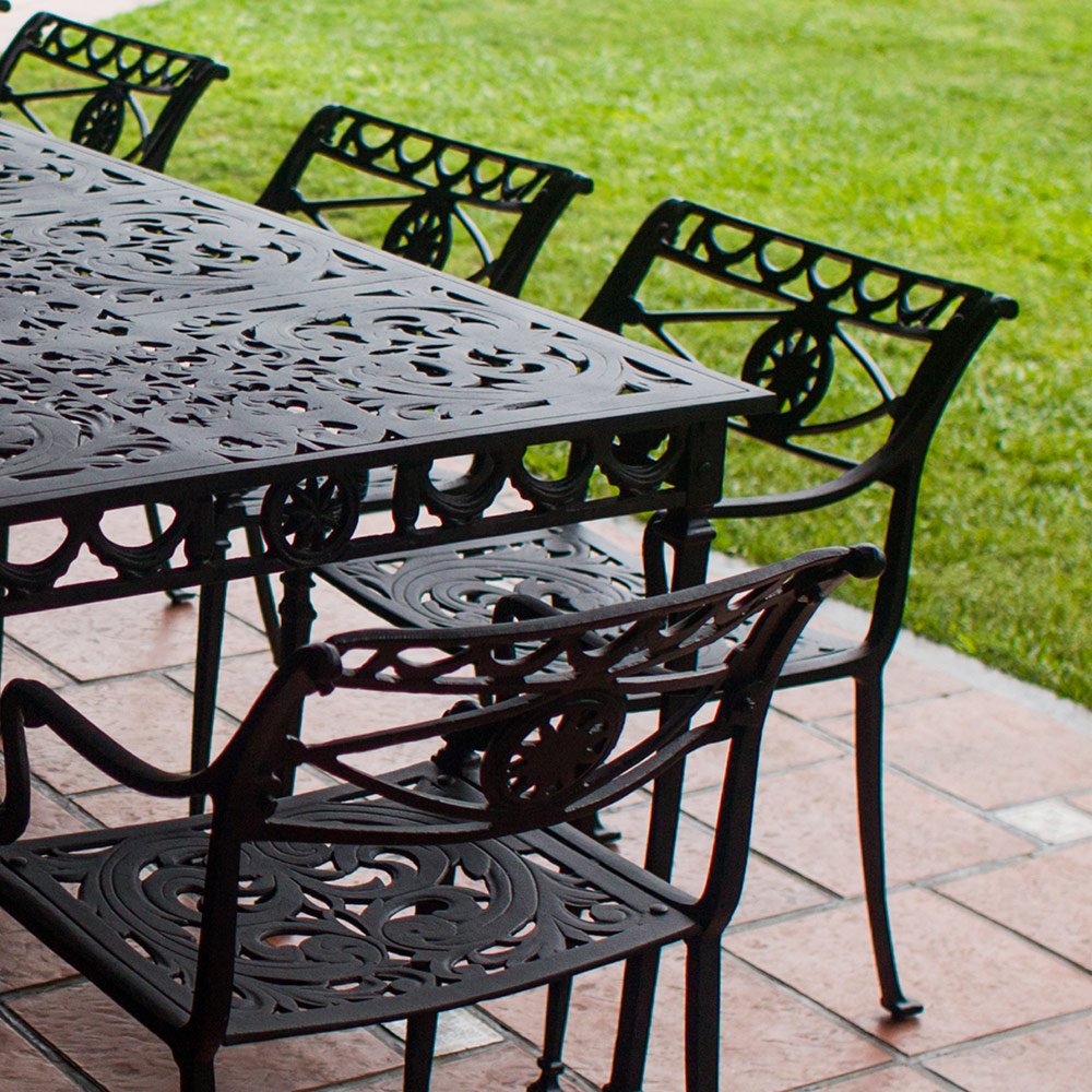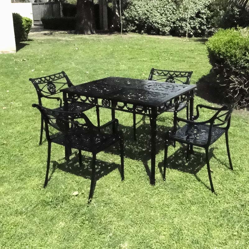 Mesa de 1,50 m de largo, fabricada completamente en fundición de aluminio y pintada con pintura epoxi en varios colores y pátinas. Su diseño elegante y resistente la convierte en una pieza ideal para exteriores e interiores, combinando estilo, durabilidad y fácil mantenimiento.