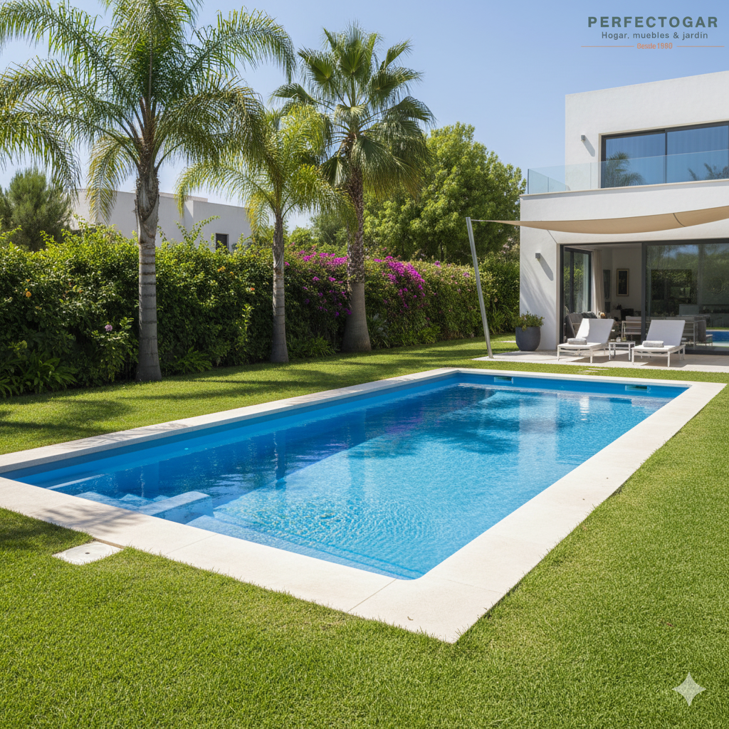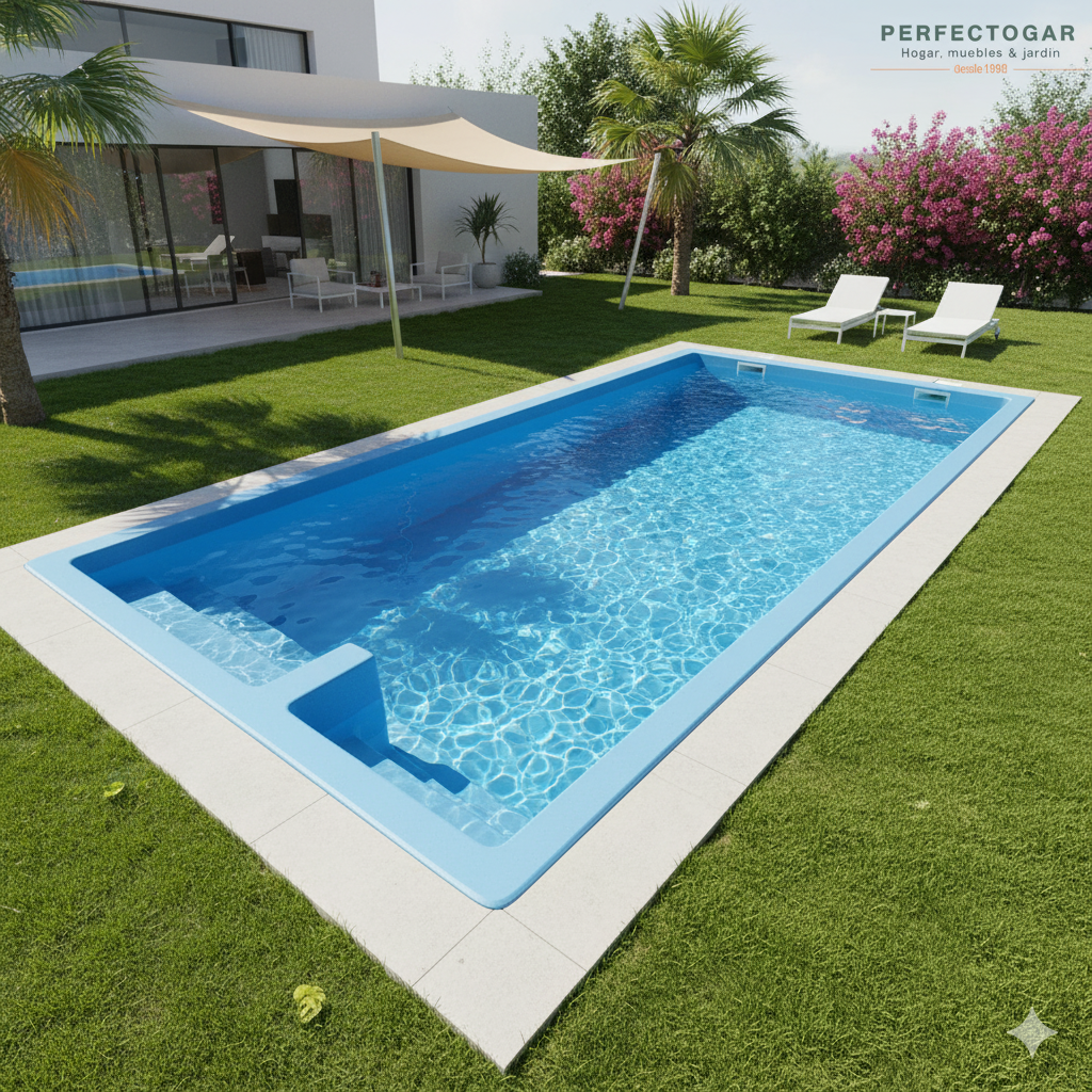 La Piscina de fibra de vidrio reforzada de Perfectogar mide 715 x 330 cm con una profundidad variable de 130 a 160 cm. Su estructura sólida asegura durabilidad, mientras que las opciones de colocación, filtros y luces permiten personalizar la experiencia para disfrutar al máximo.