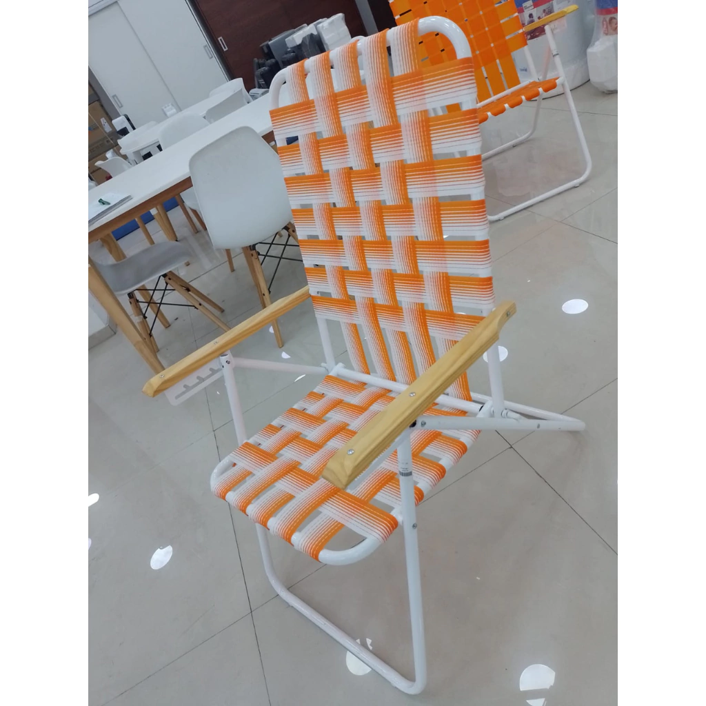 Reposera con estructura de caño y respaldo reclinable en 5 posiciones. Liviana, resistente y fácil de mover.