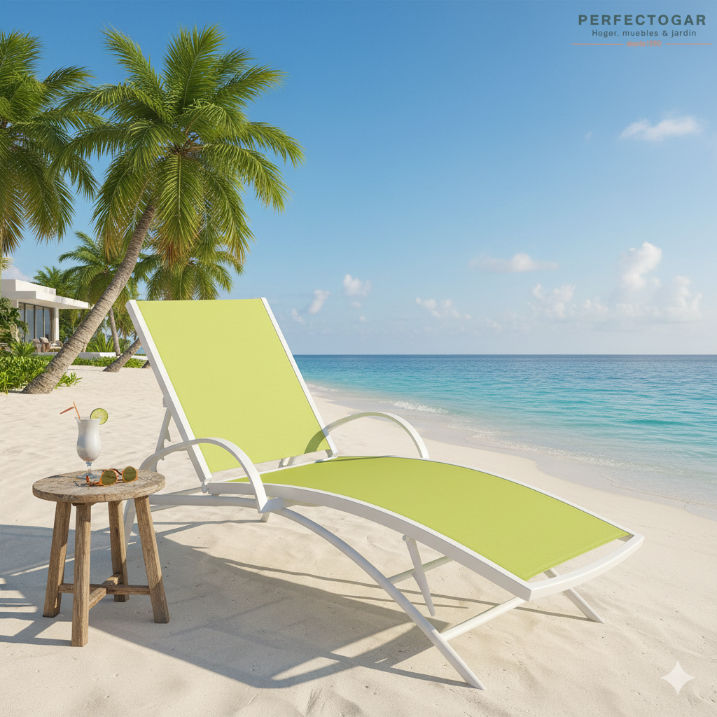 Reposera Fario en color verde, con respaldo reclinable y estructura resistente. Perfecta para relajarse al sol con estilo.