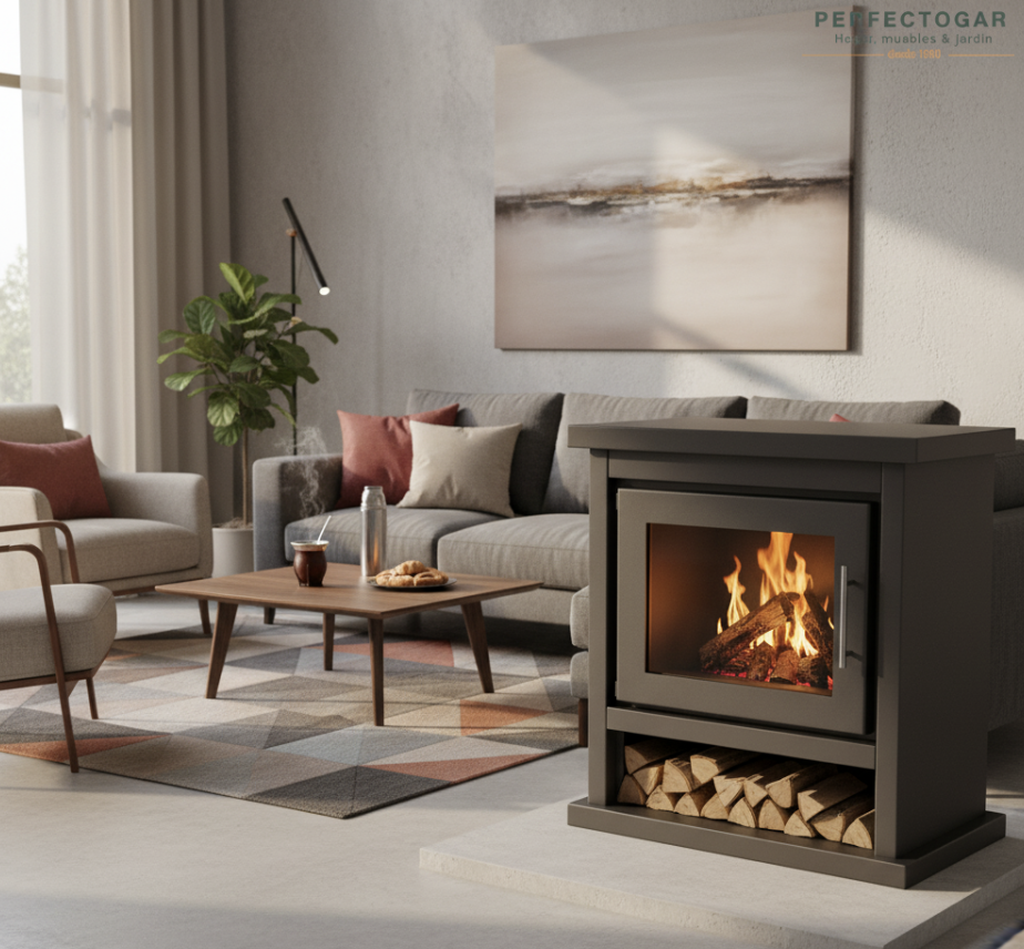Salamandra a gas con leño decorativo de 6000 calorías, diseñada para calefaccionar ambientes amplios con un formato frontal moderno, resistente y práctico.