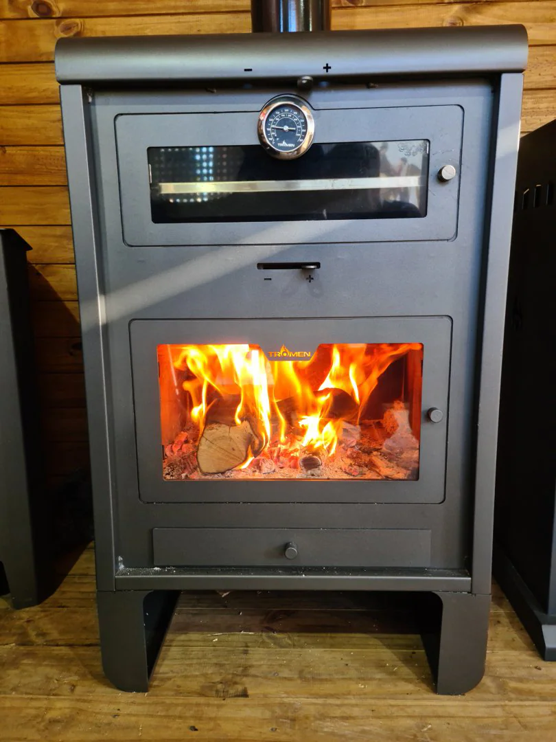 Salamandra Tromen Pehuen de 18.000 kcal/h con horno incorporado, diseñada para climatizar ambientes de hasta 160 m². Su estructura robusta y su horno integrado la convierten en una opción versátil para calefaccionar y cocinar al mismo tiempo.