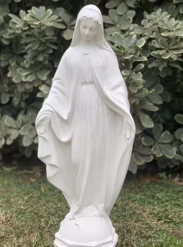 Escultura de la Virgen Medalla Milagrosa de 135 cm, ideal para espacios de oración, jardines y templos. Su diseño detallado y resistente transmite paz y espiritualidad.